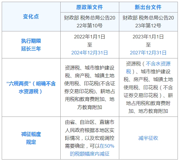 根據(jù)《公告》規(guī)定:“二、自2023年1月1日至2027年12月31日,對增值稅小規(guī)模納稅人、小型微利企業(yè)和個體工商戶減半征收資源稅(不含水資源稅)、城市維護建設(shè)稅、房產(chǎn)稅、城鎮(zhèn)土地使用稅、印花稅(不含證券交易印花稅)、耕地占用稅和教育費附加、地方教育附加。”(簡稱“六稅兩費”)
